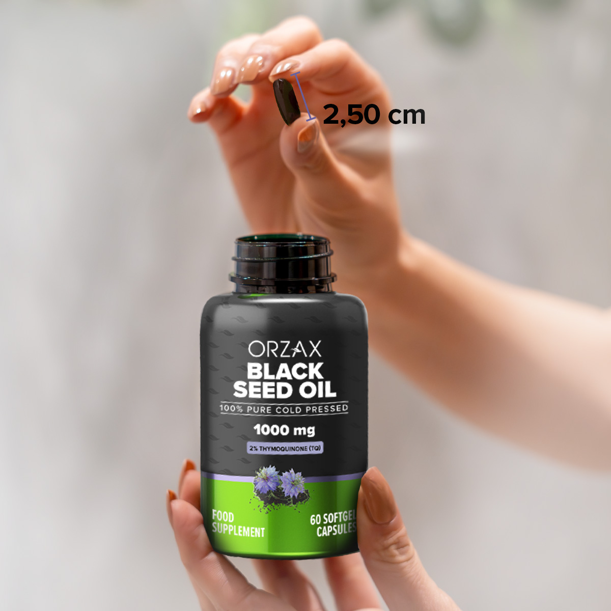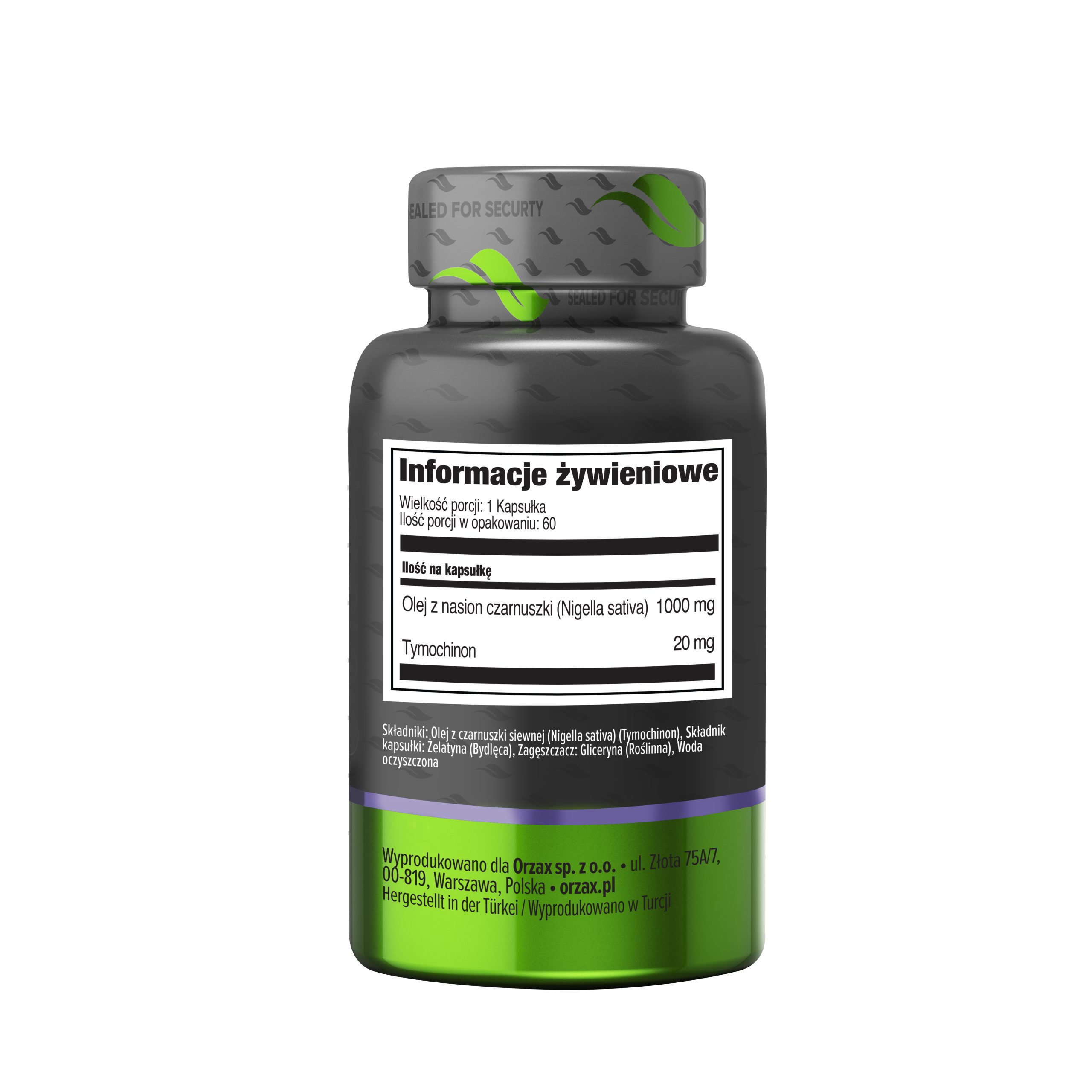 Orzax olej z czarnuszki w kapsułkach dostarcza 100% czystego, tłoczonego na zimno oleju z nasion czarnuszki (Nigella sativa), naturalnie zawierającego 2% tymochinonu i bogatego w kwasy tłuszczowe.